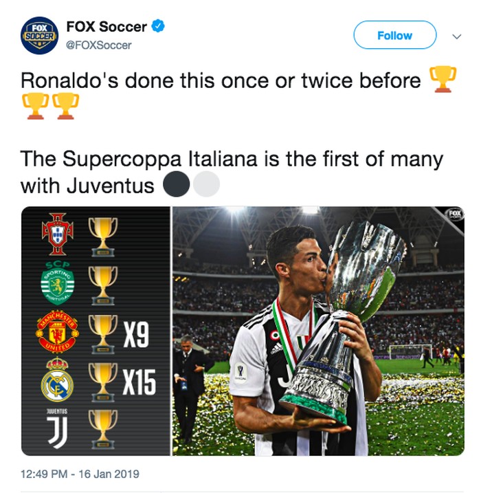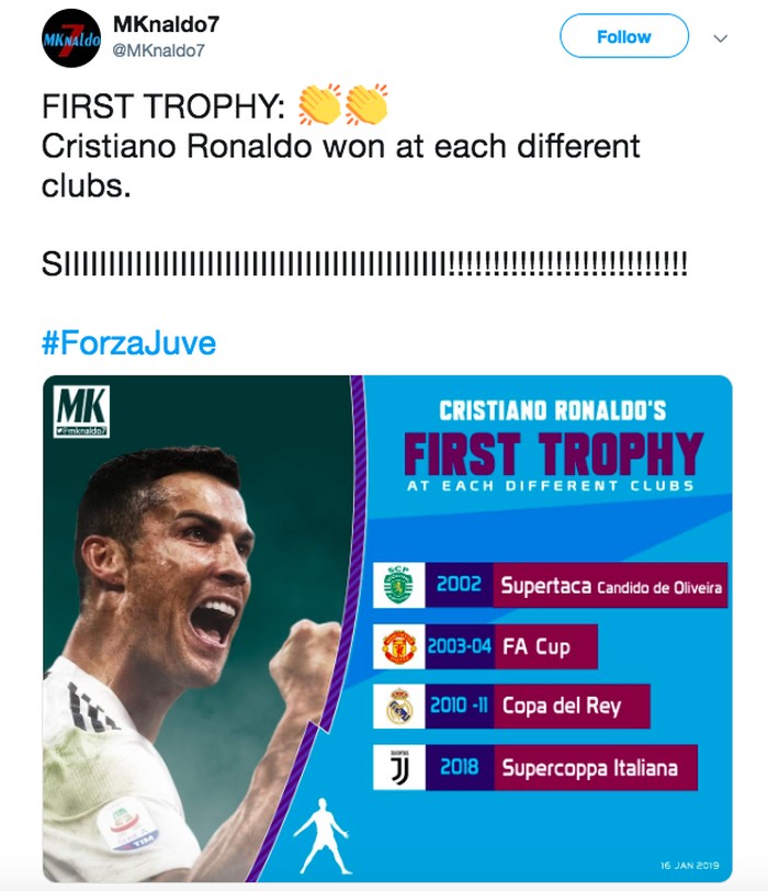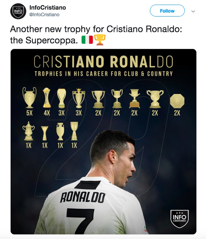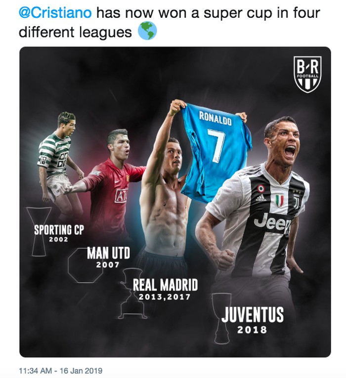 Banyak statistik soal kehebatan Ronaldo beredar di medsos. Saah satunya, ia telah memenangkan Piala Super di 4 liga yang berbeda. Foto: istimewa