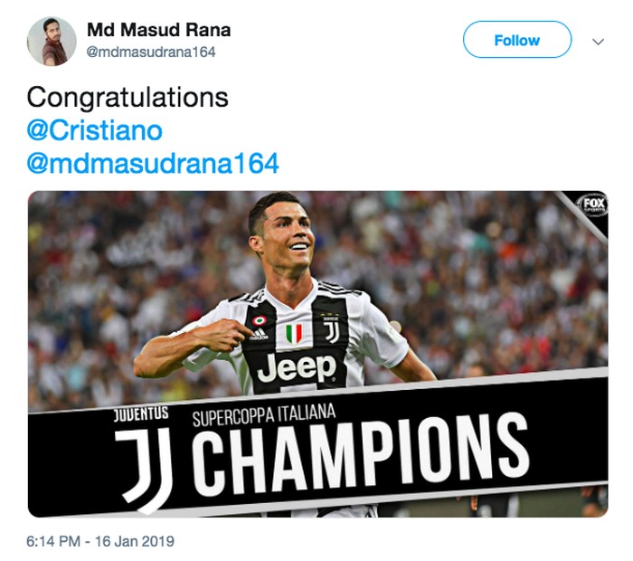 Cristiano Ronaldo menjadi penyumbang gol satu-satunya dalam kemenangan Juventus atas AC Milan di final Piala Super Italia. Medsos pun banjir pujian untuknya.