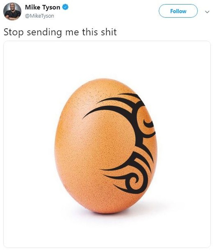 Lucunya, Mike Tyson melalui akun Twitter miliknya malah kesal dengan kedatangan si telur lantaran ada yang menambahkan tato miliknya di telur tersebut. Foto: Istimewa