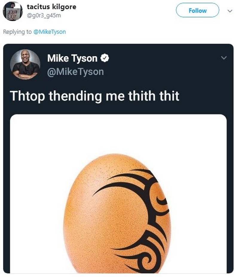 Lucunya, Mike Tyson melalui akun Twitter miliknya malah kesal dengan kedatangan si telur lantaran ada yang menambahkan tato miliknya di telur tersebut. Foto: Istimewa