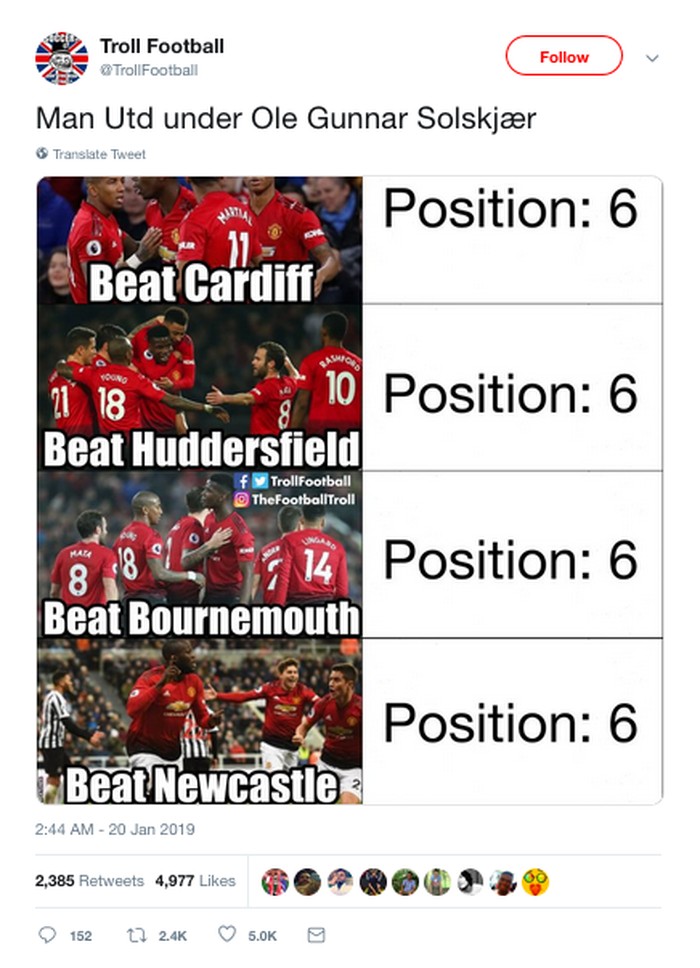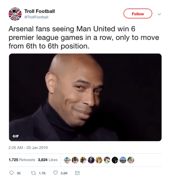Nah, kemenangan Arsenal atas Chelsea ikut bikin Manchester United kena sindir netizen. Ini terkait posisi MU yang di situ-situ saja walaupun punya tren bagus. (Foto: Internet/Twitter)