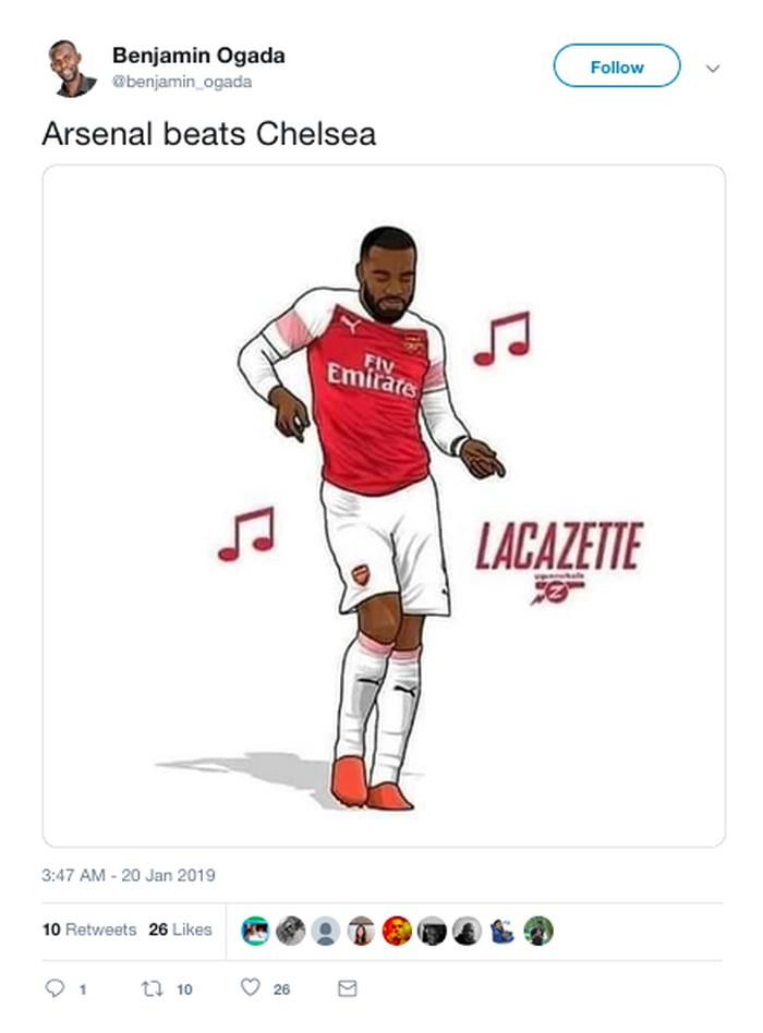 Alexandre Lacazette menjadi pembuka kemenangan Arsenal atas Chelsea. (Foto: Internet/Twitter)