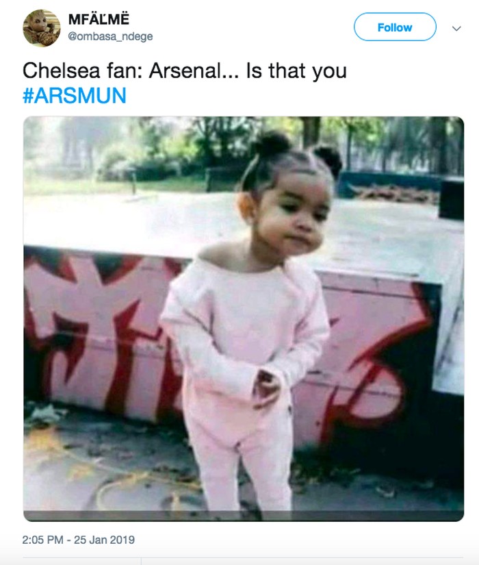 Fans Chelsea mencari para fans Arsenal yang mungkin sedang sembunyi. Foto: istimewa