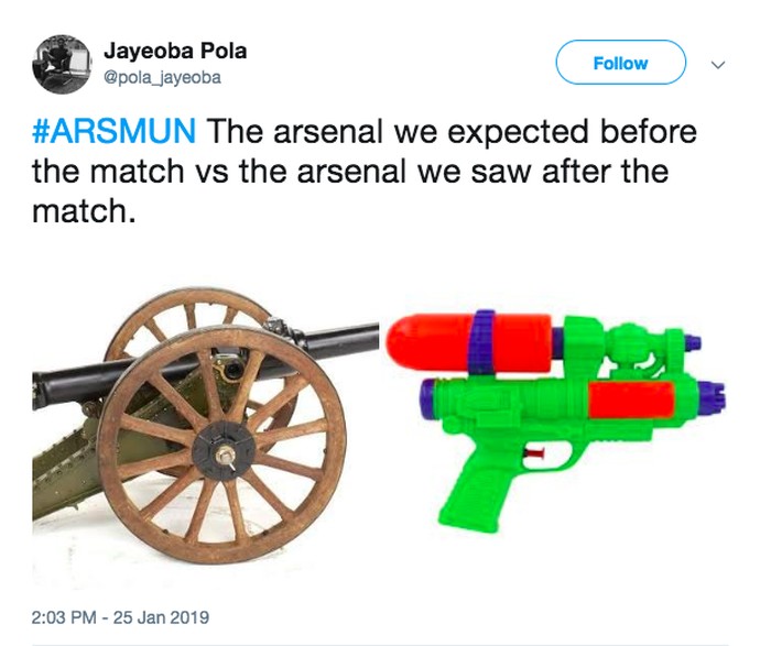 Meriam Arsenal berubah jadi pistol mainan. Foto: istimewa