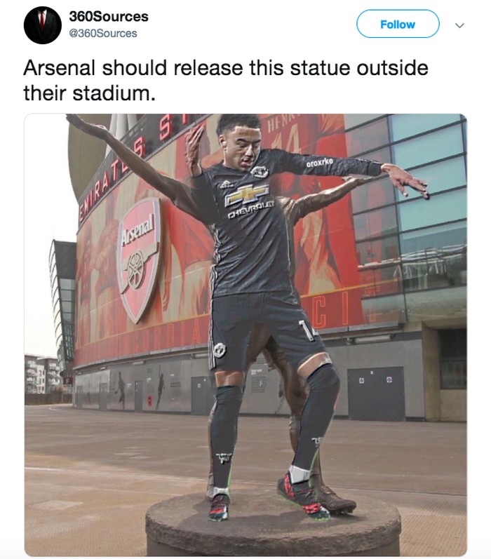 Patung Jesse Lingard sedang berdansa semalam setelah mengelabui pertahanan Arsenal. Foto: istimewa