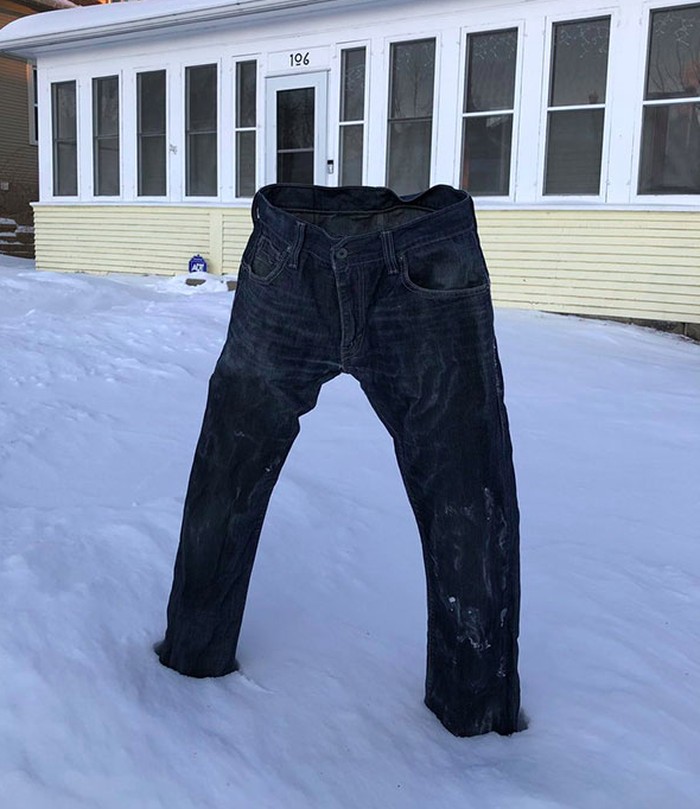 Celana jeans beku di depan sebuah rumah di Minnesota. Foto: boredpanda