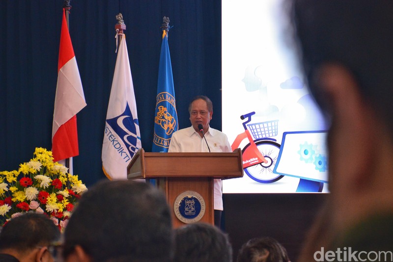 Menristekdikti Mohamad Nasir mengaku senang dengan banyak inovasi yang dilahirkan oleh anak muda Indonesia. Dia juga meminta di era digital saat ini perguruan tinggi harus bisa mengikuti perkembangan zaman. Foto: Satria Nandha/detikcom
