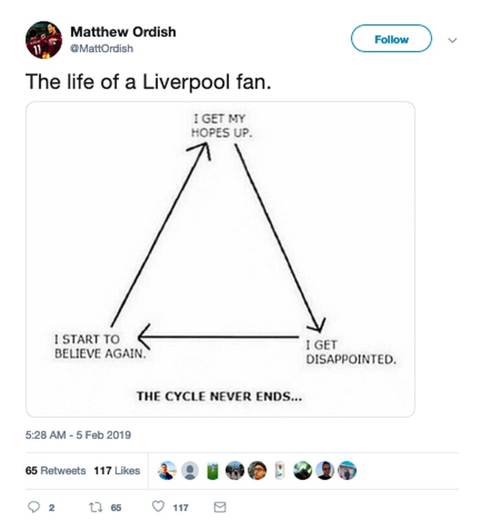 HalΒ macam ini dianggap jadi siklus rutin bagi fans Liverpool. (Foto: Internet/Twitter)