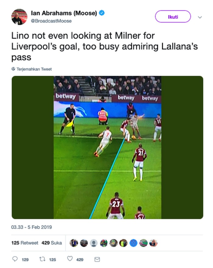 Shkodran Mustafi dari Arsenal sampai dibawa-bawa untuk "muncul" di lapangan sehingga Milner tidak offside. (Foto: Internet/Twitter)