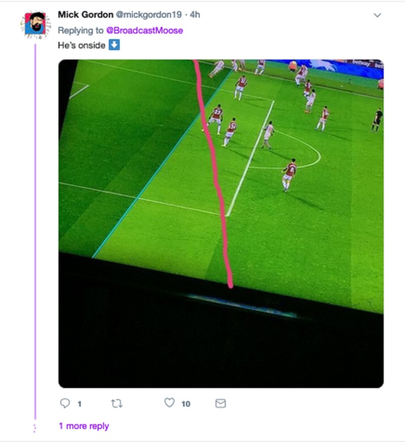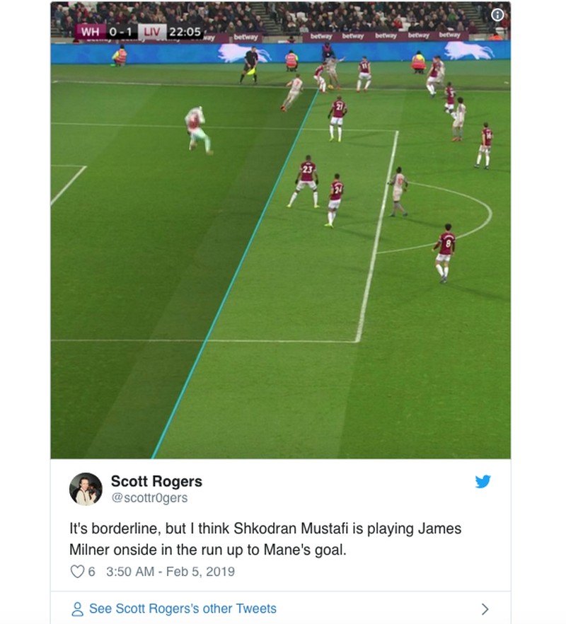 Shkodran Mustafi dari Arsenal sampai dibawa-bawa untuk "muncul" di lapangan sehingga Milner tidak offside. (Foto: Internet/Twitter)
