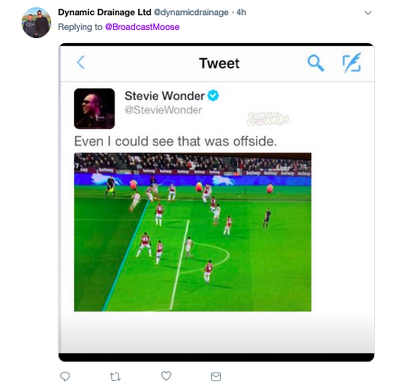 Meme ini memperlihatkan musisi kondang Stevie Wonder, yang juga seorang tunanetra, bahkan yakin ada offside dalam proses gol Liverpool. (Foto: Internet/Twitter)