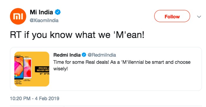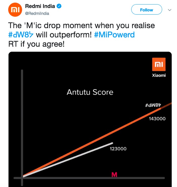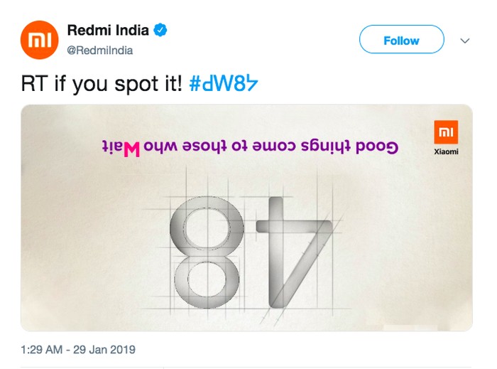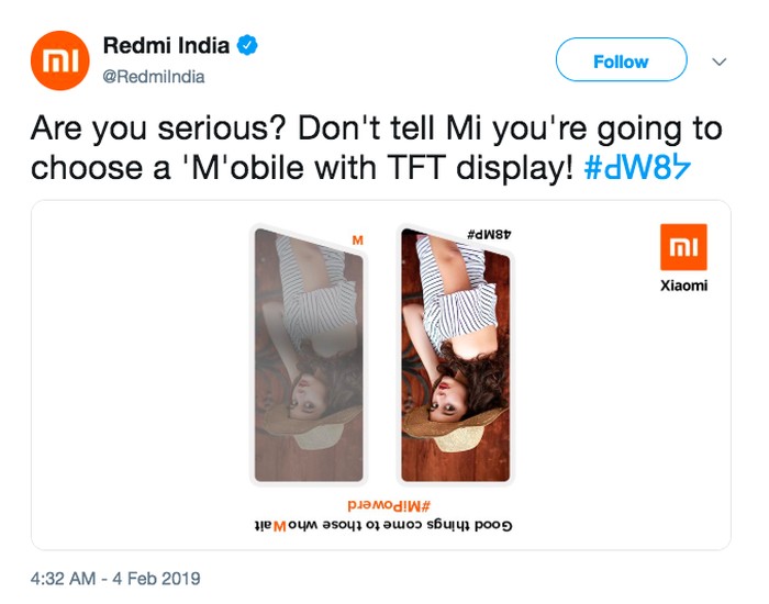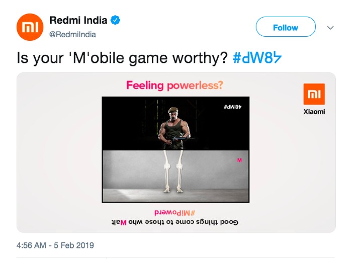 Galaxy M10 dan M20 telah dijual di India sedangkan Xiaomi Redmi 7 sebagai senjata andalan belum datang. Maka akun Twitter Redmi India terus memajang keunggulan Redmi 7 seperti kamera 48 megapixel. Gambar tweet sengaja dibalik supaya huruf W jadi M, yang jelas menyasar Galaxy M. "Hal bagus terjadi pada yang mau menunggu," tulis tweet ini. Foto: Twitter