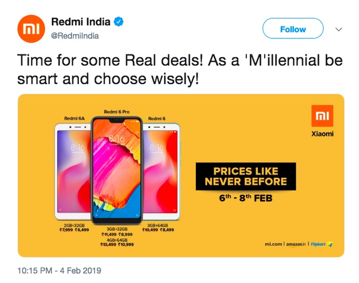 Rangkaian serangan Redmi itu kemudian berujung pada pemangkasan harga beberapa seri smartphone Redmi 6 bersamaan dengan penjualan perdana Galaxy M di India yang kabarnya laris manis. Foto: Twitter