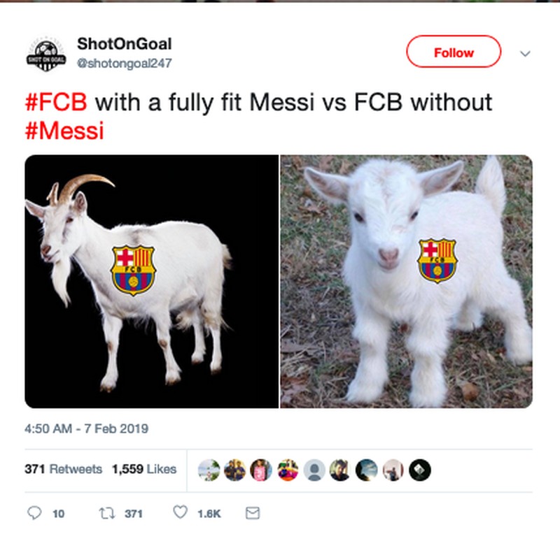 Dengan Messi, Barca diibaratkan seperti kambing dewasa nan tangguh. Tanpa dirinya, Barca jadi imut-imut banget. (Foto: Internet/Twitter)