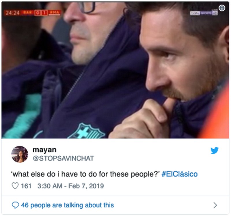 Yang ini berguyon betapa Messi pasti gregetan ingin main melihat aksi rekan-rekan setimnya. Ia akhirnya baru mulai main di pertengahan babak kedua. (Foto: Internet/Twitter)