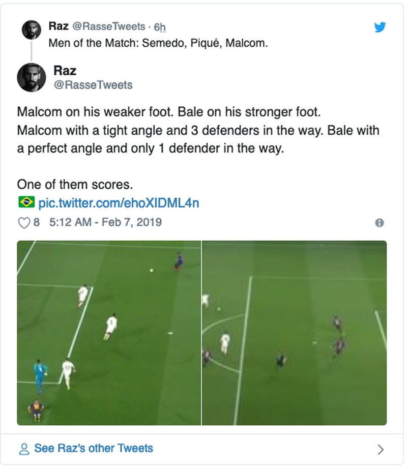 Meme ini membandingkan Bale yang semestinya dengan mudah bikin gol buat Madrid, dengan Malcom yang mampu mencetak gol untuk Barcelona dalam situasi yang relatif lebih sulit. (Foto: Internet/Twitter)