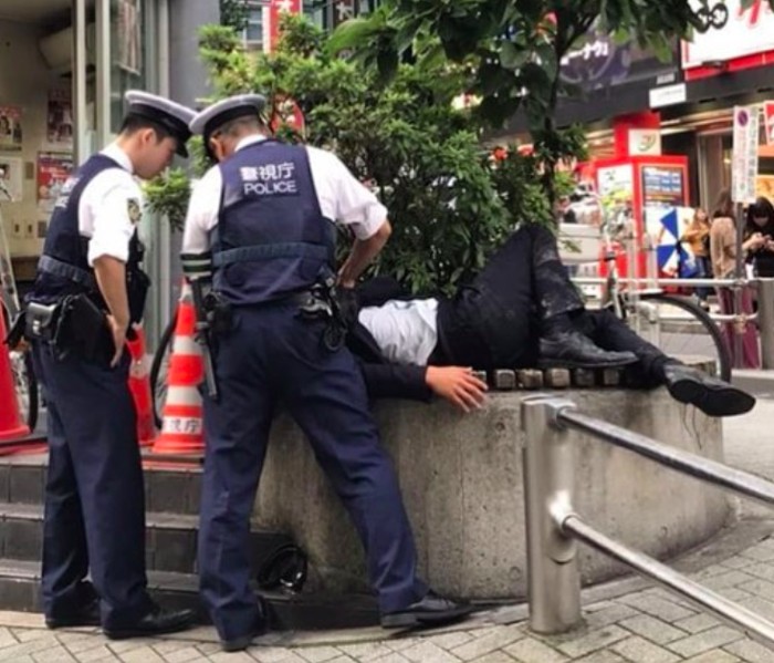 Polisi memeriksa seorang salaryman yang mungkin sudah lama tertidur di jalanan. Foto: Instagram