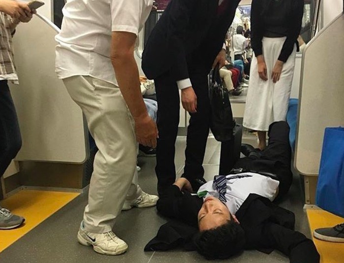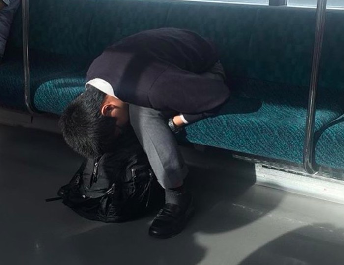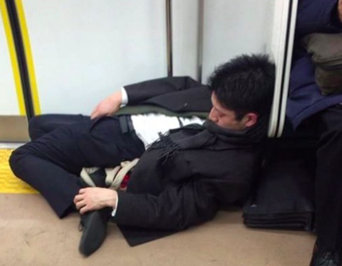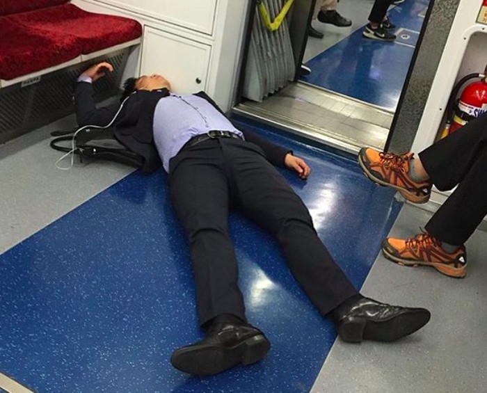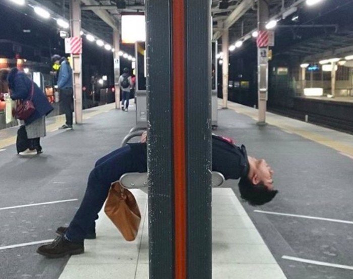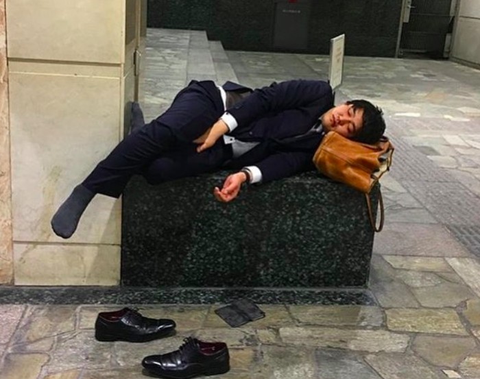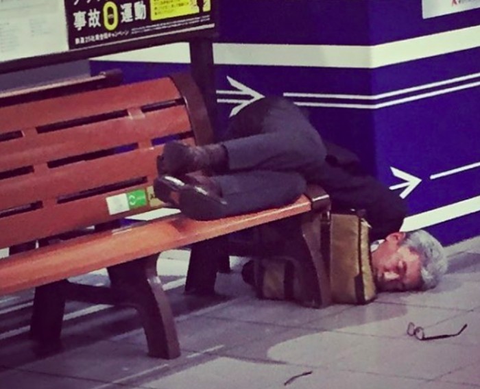 Salah seorang karyawan senior tergeletak di kursi sampai dan terlihat sangat lelah. Jepang memang dikenal negara yang rakyatnya sangat bekerja keras. Foto: Instagram
