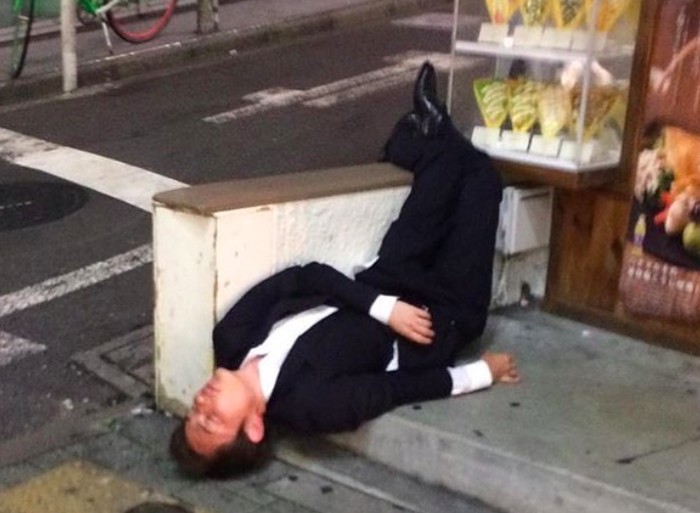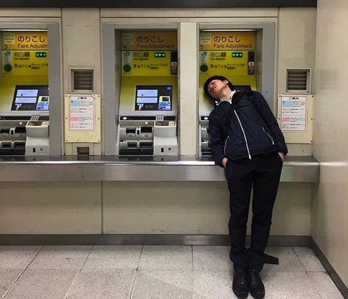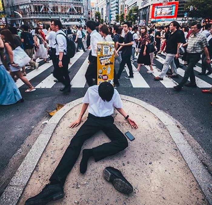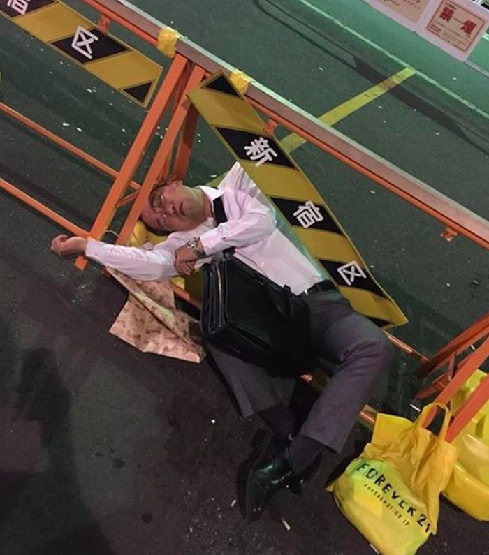 Seorang karyawan masih belum pulih dari rasa lelahnya di tengah keramaian Tokyo. Foto: Instagram