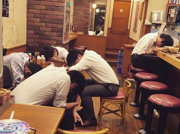 Salaryman diharapkan bekerja lembur dan masih harus mengikuti kegiatan setelah bekerja seperti minum-minum atau karaoke. Foto: Instagram