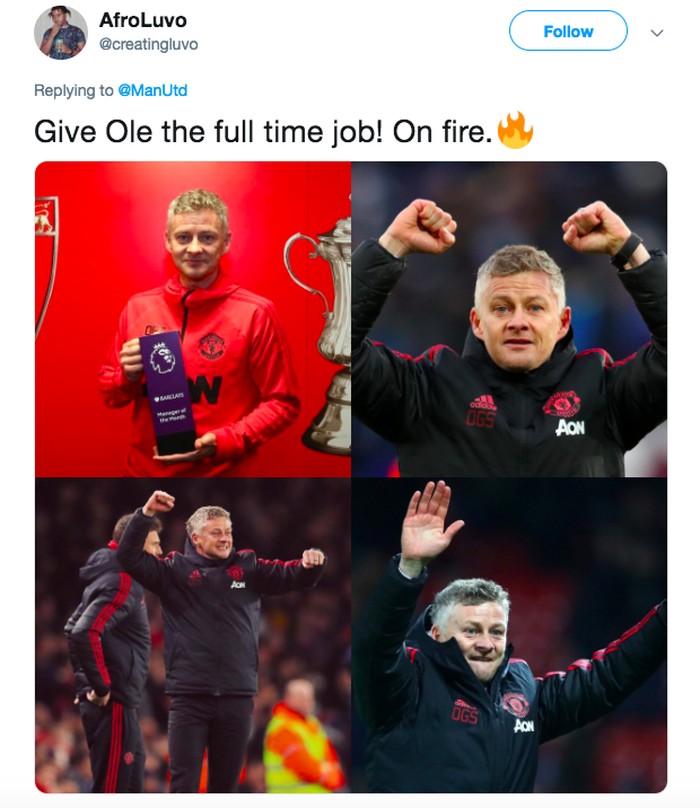 Netizen ini menilai sudah saatnya Solskjaer jadi pelatih permanen MU. Foto: istimewa