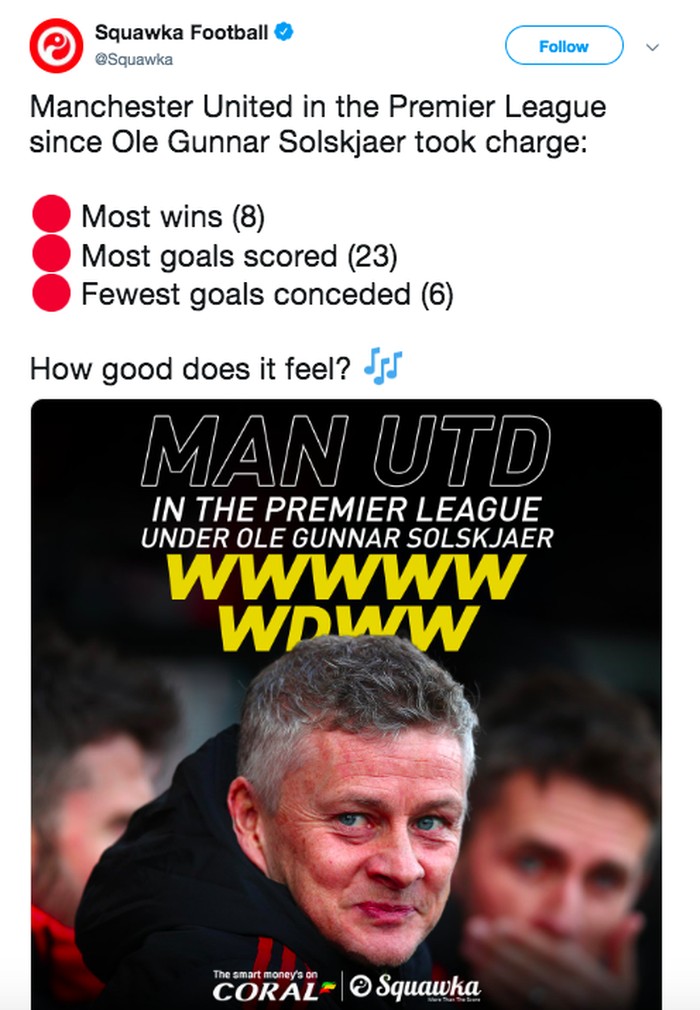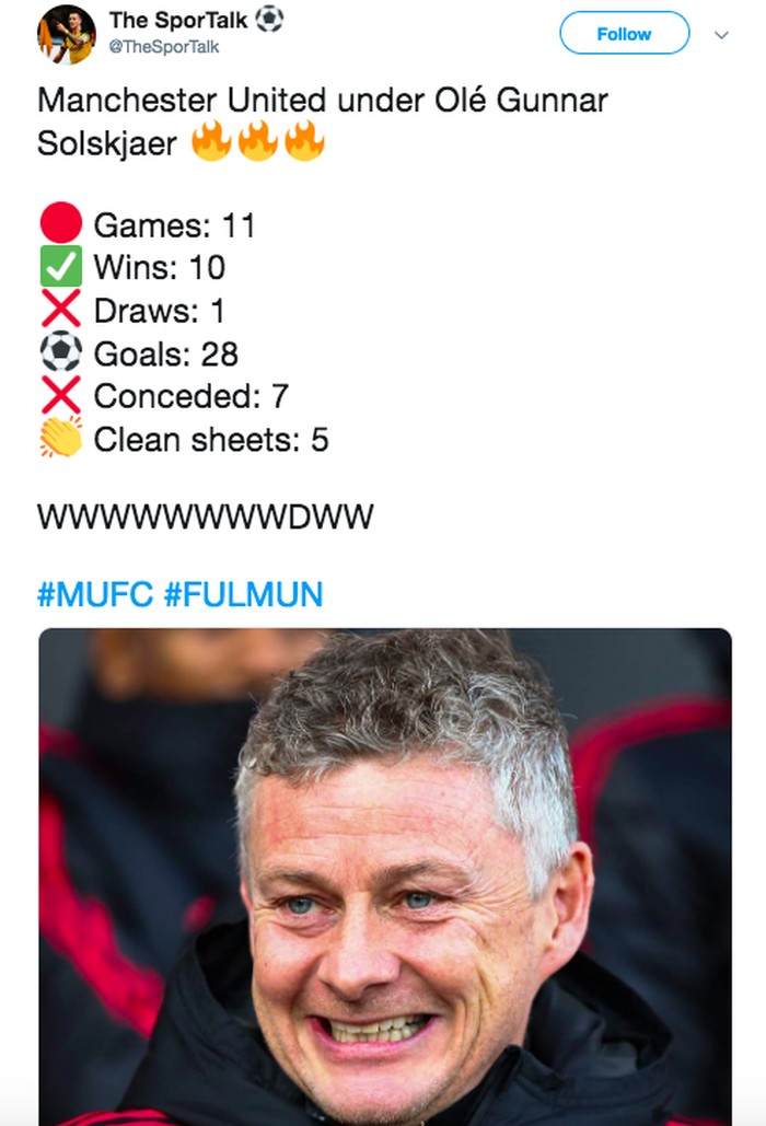 Rekor kemenangan Solskjaer sudah melebih Mourinho walaupun baru melatih MU sebentar. Foto: istimewa