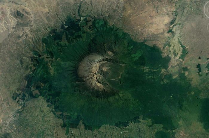 Ini disebutnya sebagai gunung berapi simetris di semenanjung Kamchatka di Rusia. Ada lingkaran-lingkaran merah di sisinya yang menarik. Foto: boredpanda