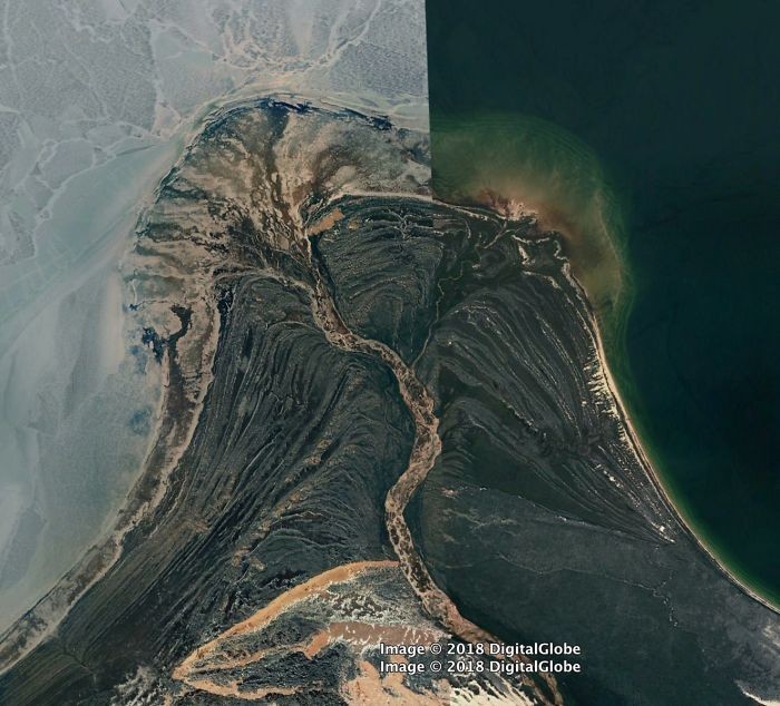 Sebuah delta yang menarik di sungai William di California dengan warna berbeda-beda. Bagian kiri sepertinya diselimuti es. Foto: boredpanda
