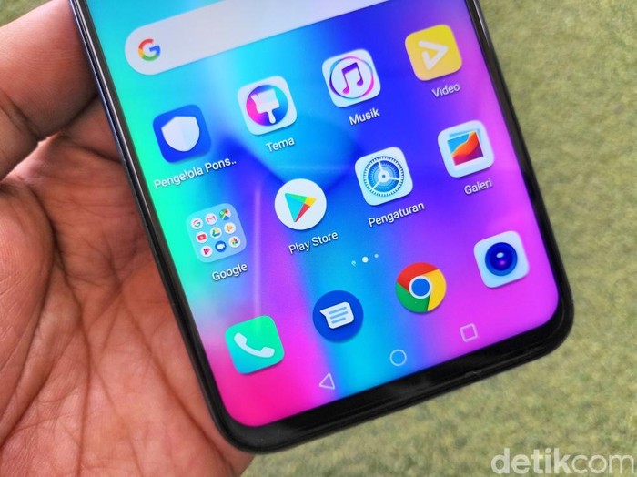 Ada tiga tombol operasional virtual di bagian bawah. Jeroannya mengandalkan prosesor HiSilicon Kirin 710. Versi yang dijepret ini memilki RAM 4 GB dan memori internal 64 GB. Foto: detikinet
