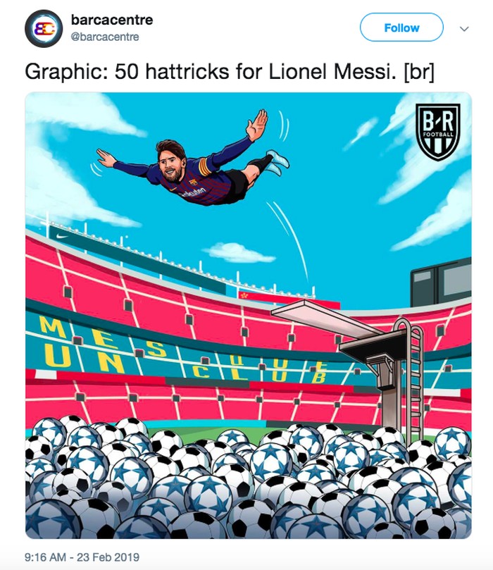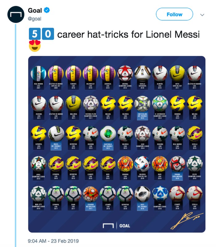 Berbagai pertandingan di mana Messi mencetak hattrick. Dengan hattrick semalam, berarti dia sudah 50 kali mencetak tiga gol dalam satu pertandingan. Foto: istimewa
