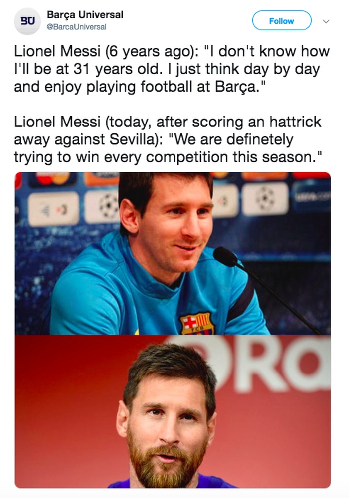 Messi pada 6 tahun lampau mengaku tidak tahu apa yang akan terjadi di umur ke-31. Ternyata sekarang ia tetap trengginas dan selalu mengejar kemenangan. Foto: istimewa