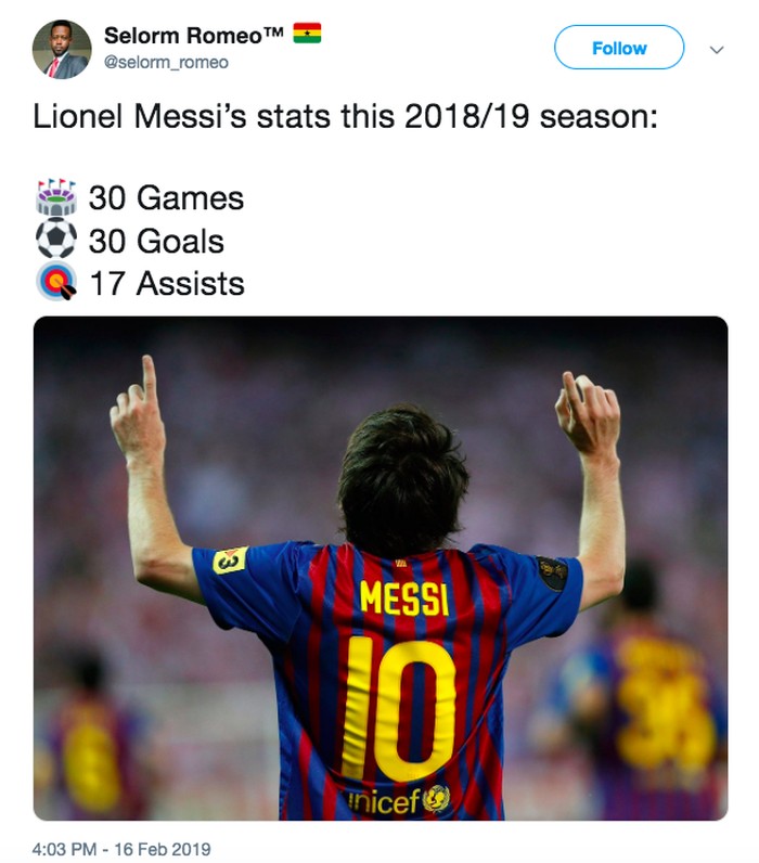 Musim ini, statistik Messi cukup mengagumkan jika melihat data yang dipajang di Twitter ini. Foto: istimewa