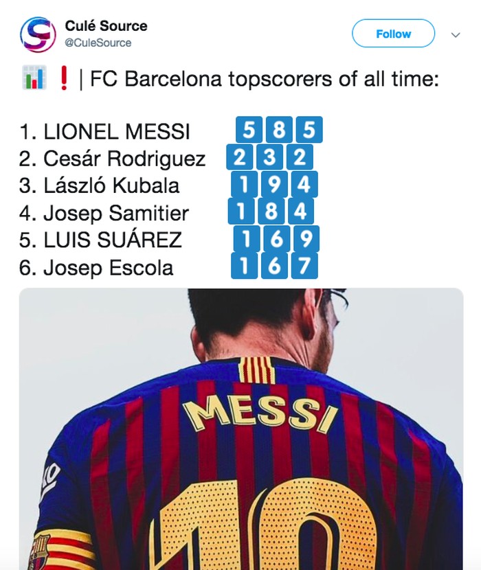 Messi jauh meninggalkan legenda lain sebagai top skor Barcelona. Foto: istimewa