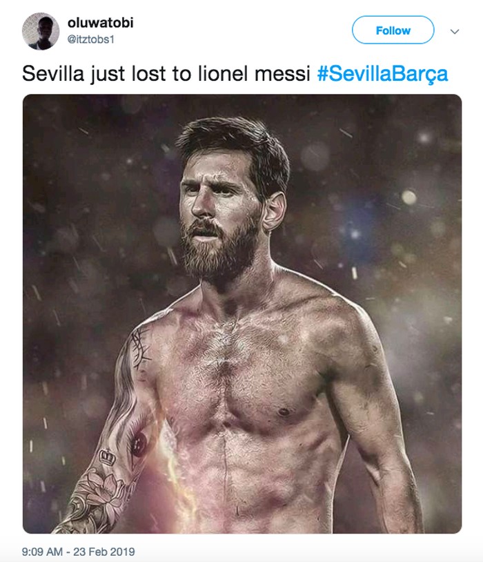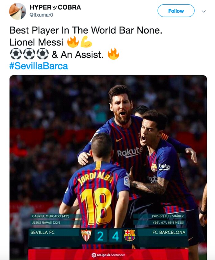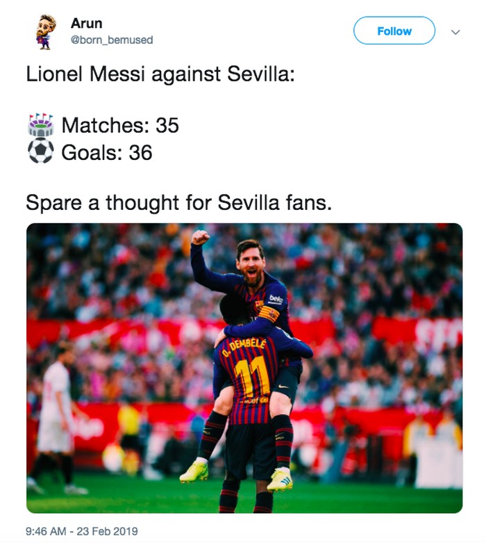 Rekor Messi lawan Sevilla yang luar biasa juga diposting di medsos, di mana dia mencetak 36 gol dalam 35 pertandingan. Foto: istimewa
