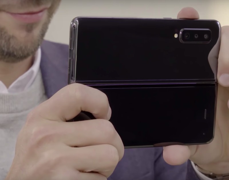 Penampakan bagian depan dan belakang Galaxy Fold. Bagian depan ada layar 4,6 inch dan satu kamera depan, sedangkan bagian belakangnya murni casing dengan tiga buah kamera.Foto: YouTube Samsung