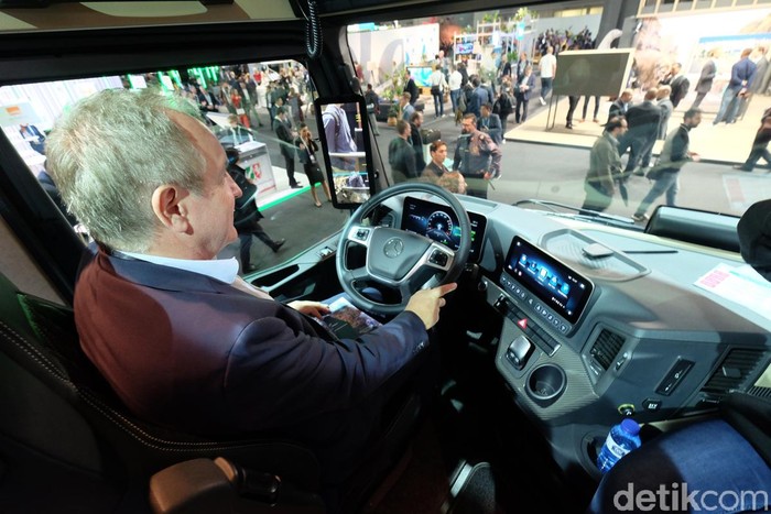 Bagian dalam dari truk terbaru Mercedes-Benz yang pastinya juga sudah dibumbui oleh kemajuan teknologi. Salah satunya adalah truk ini sudah didesain tanpa kaca spion, melainkan digantikan dengan screen mirror yang tersambung dengan kamera di bagian luar truk. Nah, di kaca spion digital itu bahkan bisa terbagi sejumlah tampilan. (Foto: detikINET/Ardhi Suryadhi)
