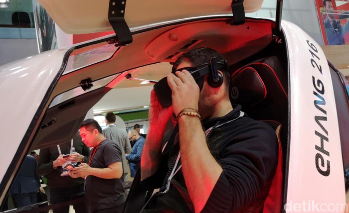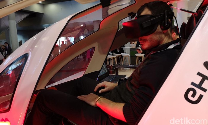 Pengunjung Mobile World Congress (MWC) 2019 bisa merasakan menaikin taksi terbang ini. Namun tidak terbang betulan, cuma duduk di kokpit lalu mengenakan perangkat virtual reality untuk bisa merasakan sensasinya. (Foto: detikINET/Ardhi Suryadhi)