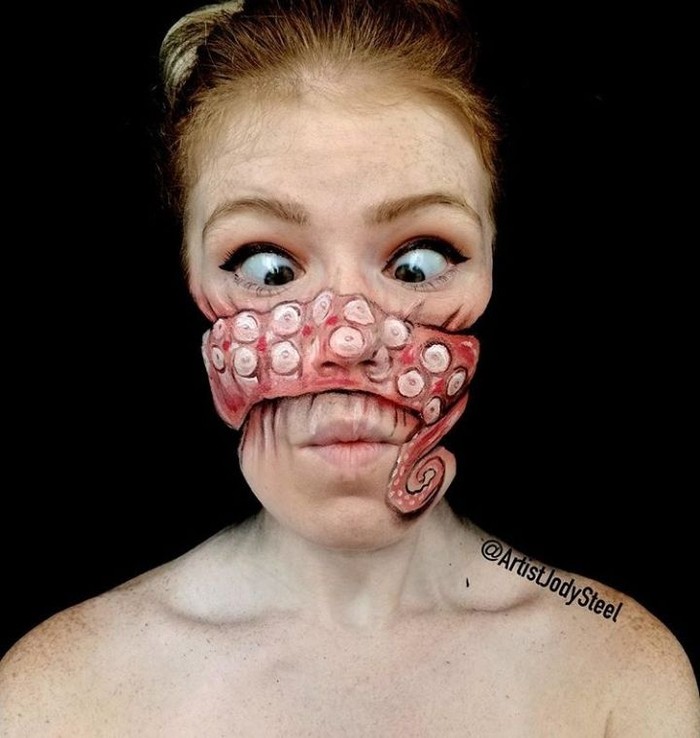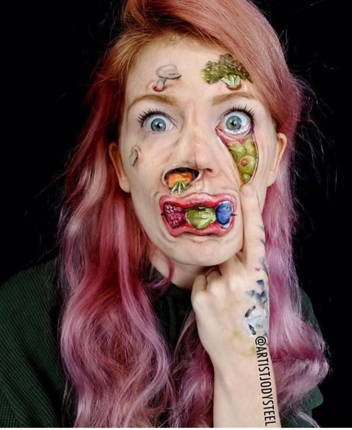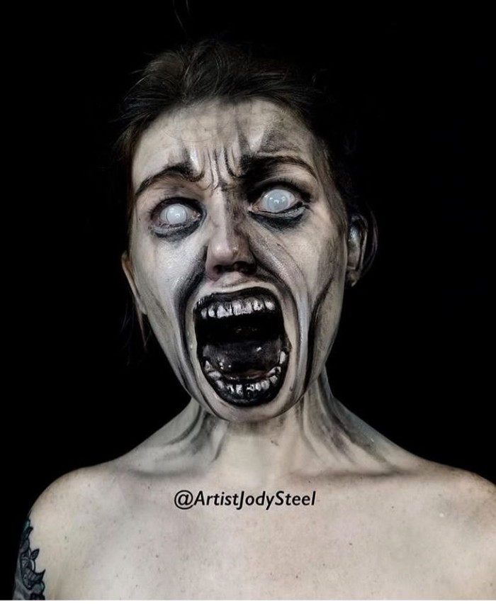 Melalui akun Instagramnya ia kerap membagikan hasil karya lukis tubuh yang keren dengan sentuhan gambar horor. Foto: Instagram @artistjodysteel