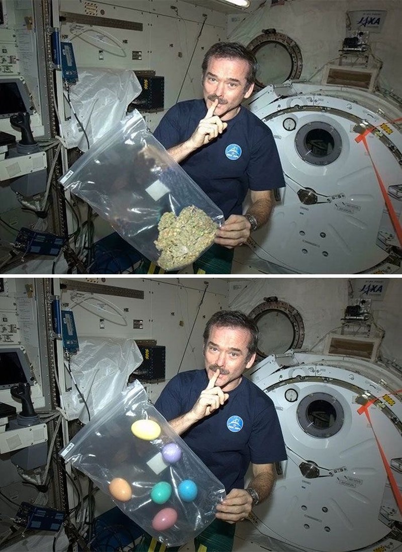 Seorang astronot Chris Hadfiels yang gemar membuat vlog tentang kehidupannya sebagai astronot sempat membuat heboh karena dirinya membawa mariyuana dalam kantong plastik saat bertugas ke luar angkasa. Faktanya, ia sebenarnya membawa benda lain yang mirip dengan telur. (Foto: Boredpanda)