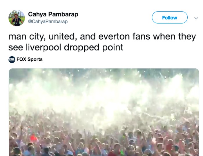 Fans City, United dan Everton bersorak karena Liverpool kembali kehilangan poin. Foto: istimewa