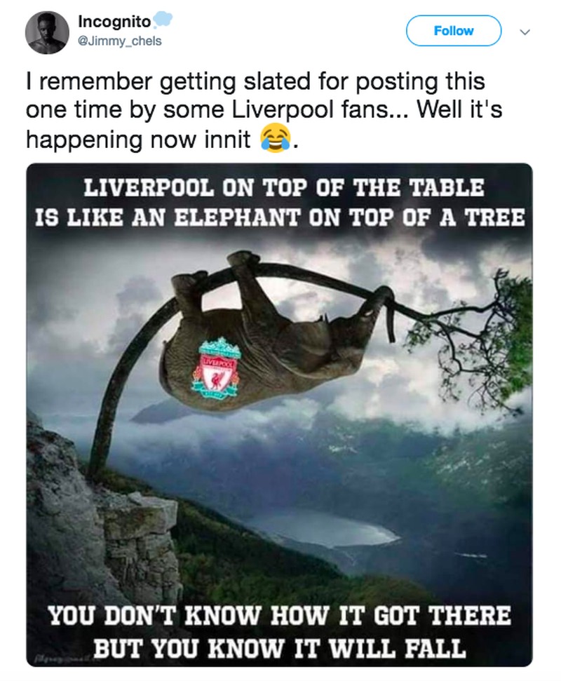 Liverpool di punca klasemen seperti seekor gajah di puncak pohon. Kalain tak tahu bagaimana ia bisa di atas sana tapi kalian tahu ia akan jatuh. Foto: istimewa