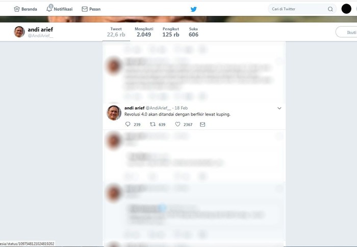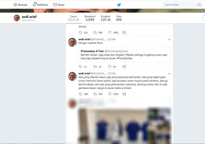 Politisi Partai Demokrat itu pun tak jarang meretweet cuitan bijak dari tokoh terkenal. Salah satunya saat ia meretweet kutipan pernyataan penulis Pramoedya Ananta Toer untuk berhati-hati dalam bertindak. Istimewa/Dok. Twitter Andi Arief.