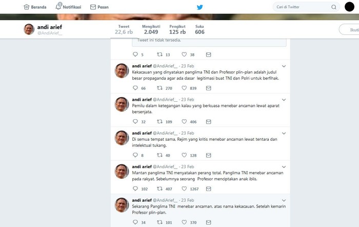 Terkait Dwi Fungsi TNI pun Andi Arief tak ketinggalan mencuit pemikirannya hingga menjadi tautan. Istimewa/Dok. Twitter Andi Arief.