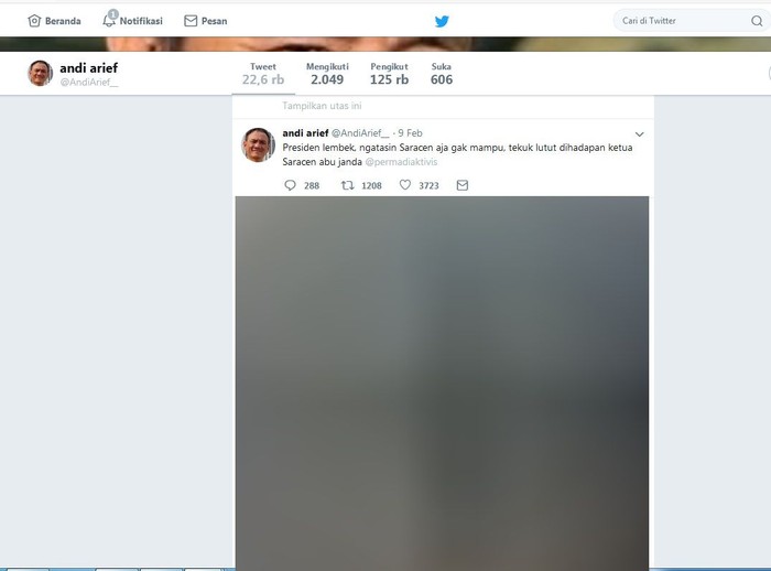 Andi Arief pun sempat melontarkan kritiknya kepada Presiden Jokowi dengan menyebutnya lembek karena tak mampu mengatasi saracen. Istimewa/Dok. Twitter Andi Arief.