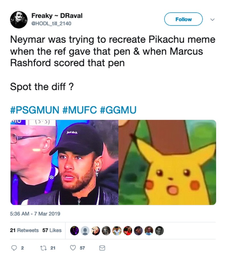 Neymar yang absen dini hari tadi ikut kena olok-olok. Ekspresi bintang PSG itu disebut meniru Pikachu. (Foto: Internet/Twitter)