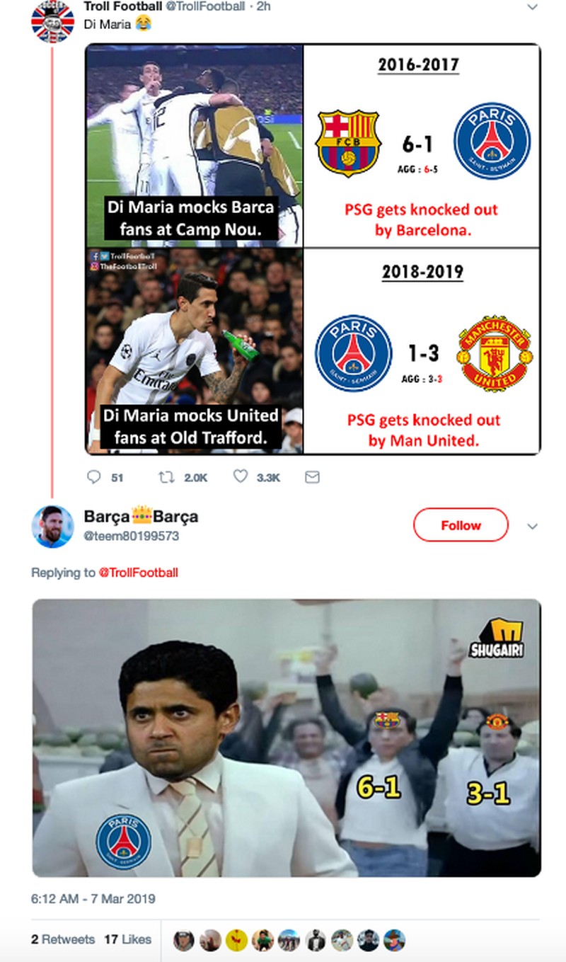 Seraya mengolok Di Maria dan bos PSG, meme ini turut mengingatkan Barcelona pun pernah melakukan comeback guna menyingkirkan PSG dari Liga Champions. Itu terjadi dua tahun lalu, juga di awal bulan Maret. (Foto: Internet/Twitter)