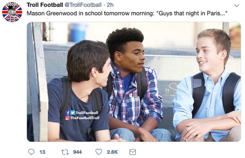 MU mengalahkan PSG tanpa sejumlah pemain reguler yang cedera. Hal itu bikin pemain muda seperti Mason Greenwood, yang masih 17 tahun, jadi ikut terlibat. (Foto: Internet/Twitter)