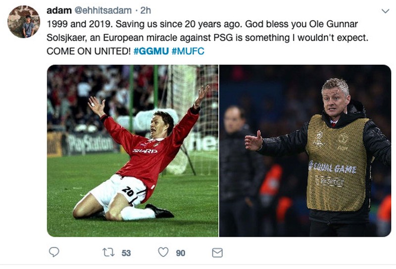 Ole Gunnar Solskjaer pun dipuji fans MU usai merancang kebangkitan di markas PSG. Mirip-mirip seperti dirinya, semasa masih bermain, ikut terlibat dalam kebangkitan MU menjuarai Liga Champions 1999. (Foto: Internet/Twitter)