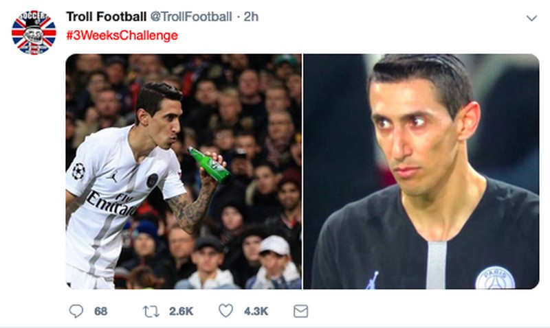 Tak sedikit pula yang meledek bintang PSG lain, Angel Di Maria. Itu jadi balasan fans MU atas sikap Di Maria dalam partai leg pertama sebelumnya. (Foto: Internet/Twitter)