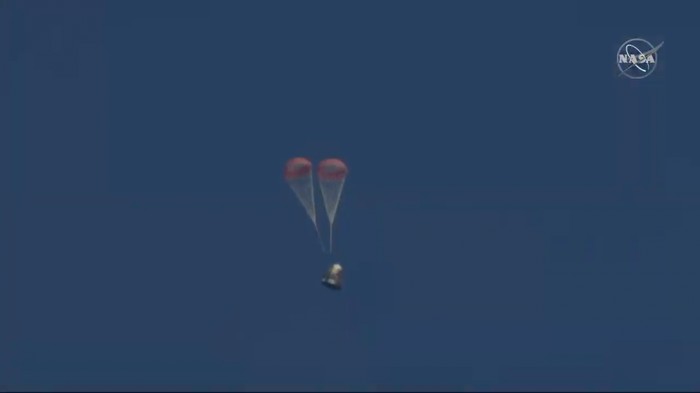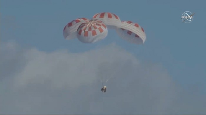 Proses pendaratan dimulai. Dapat dilihat dua parasut pertama milik Crew Dragon mulai dikembangkan. Foto:Β NASA TV